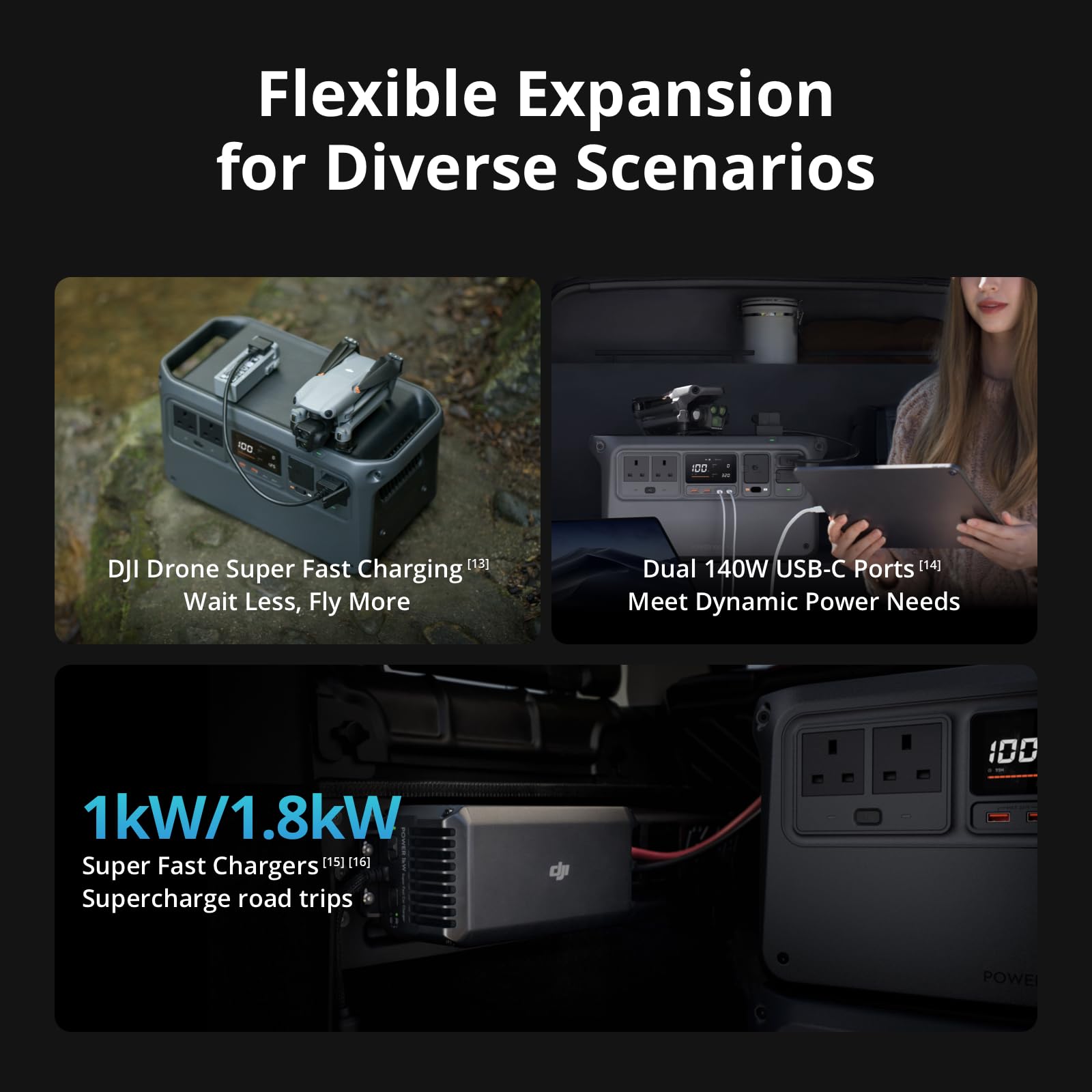 - Ready to Fly, Faster - This outdoor generator enables SDC Super Fast Charging [13] for select DJI drone batteries [20], supporting takeoff in 30 minutes—ideal for all-day filming while camping or creating on the go.
