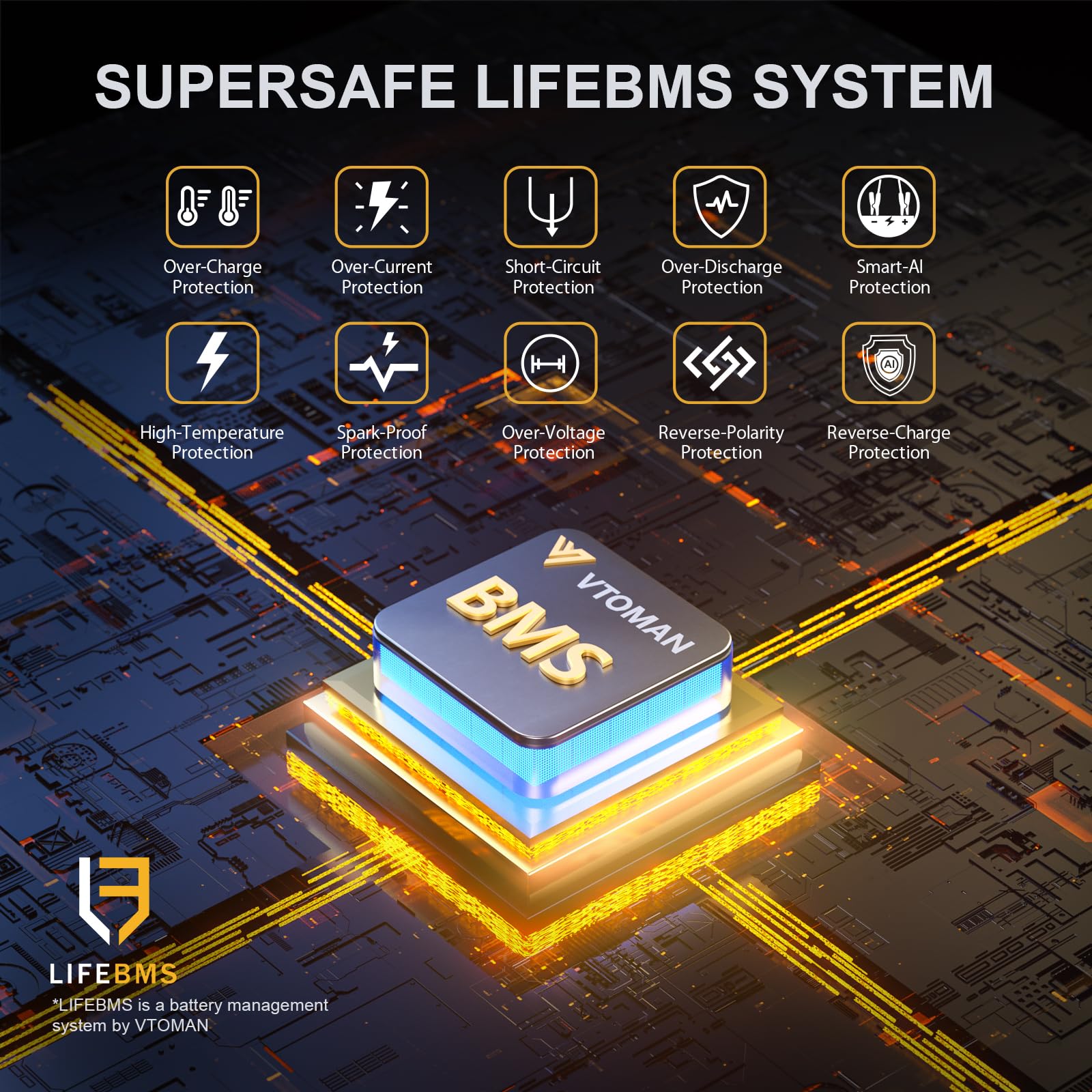 - 【Supersafe LifePO4 Battery Power Station】Designed with Supersafe LifeBMS protection system by VTOMAN, FlashSpeed 300 portable power station has over-charge protection, over-discharge protection, over-voltage protection, over-current protection, short-circuit protection, up to 10 kinds of protection. Also thanks to the built-in LiFePO4(LFP) battery, VTOMAN FlashSpeed 300 portable power station is more heat-resistant and safer compared with NCM battery stations.